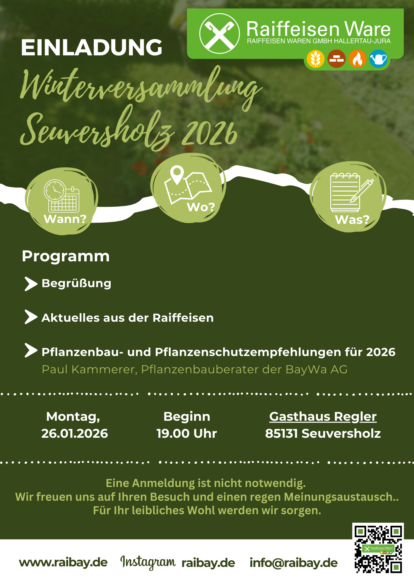 Programm: Begrüßung, Aktuelles aus der Raiffeisen, Pflanzenbau- & Pflanzenschutzempfehlungen für 2026 (Paul Kammerer, Pflanzenbauberater der BayWa AG)