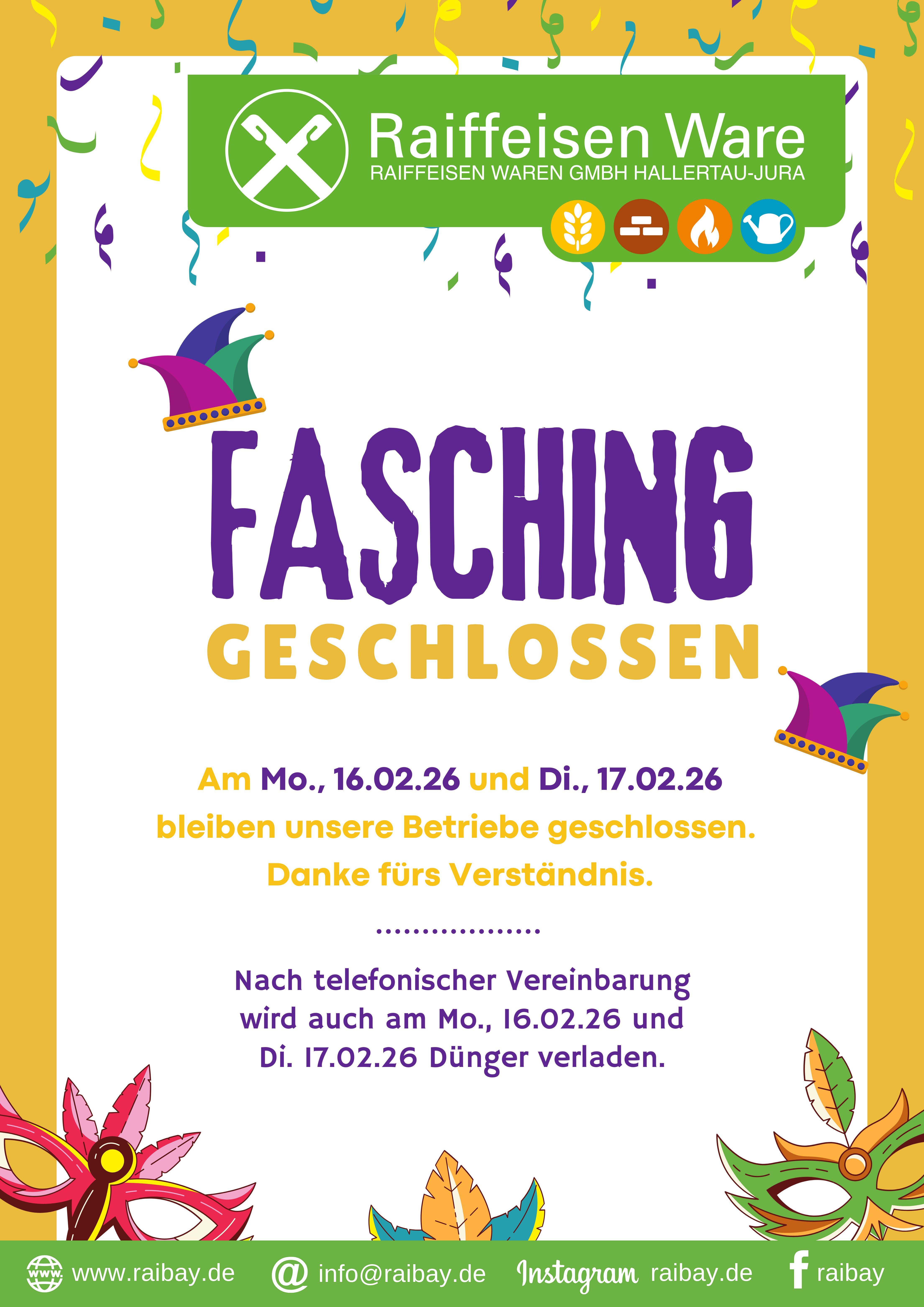 Rosenmontag 16.02.26 und Faschingsdienstag 17.02.26 geschlossen